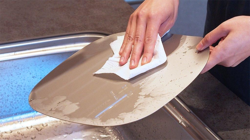 また水滴の乾燥跡や細かい傷も、使い込むと各々が重なり合い目立たなくなっていきます。鉄のフライパンを育てるように、チタンのまな板もどんどん使い込んでいってください。